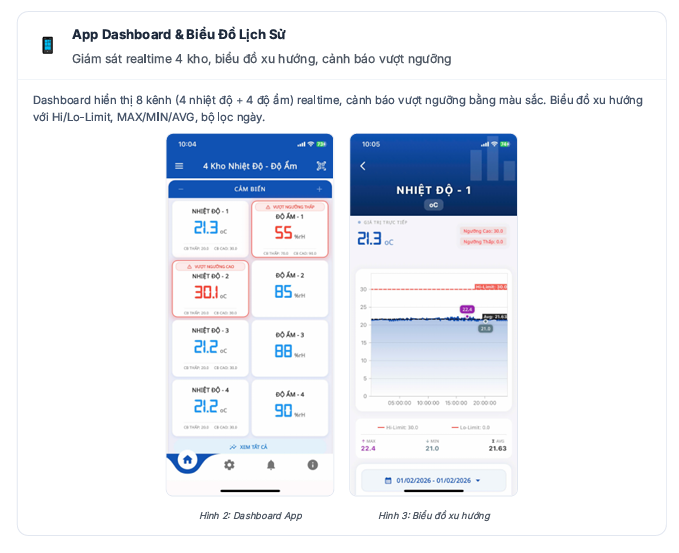 Ứng dụng Navis Smart Industry hoạt động trên Android & iOS, hiển thị giá trị nhiệt độ và độ ẩm theo thời gian thực từ 4 kho, kèm cảnh báo vượt ngưỡng và biểu đồ lịch sử.