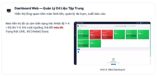 | 7 | Phần mềm Web giám sát trên máy tính | 1 license | Quản lý dữ liệu, xuất báo cáo Excel/PDF |