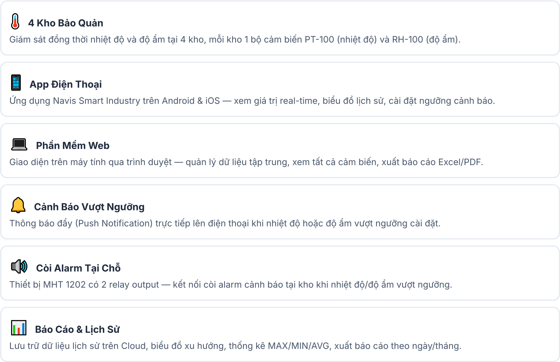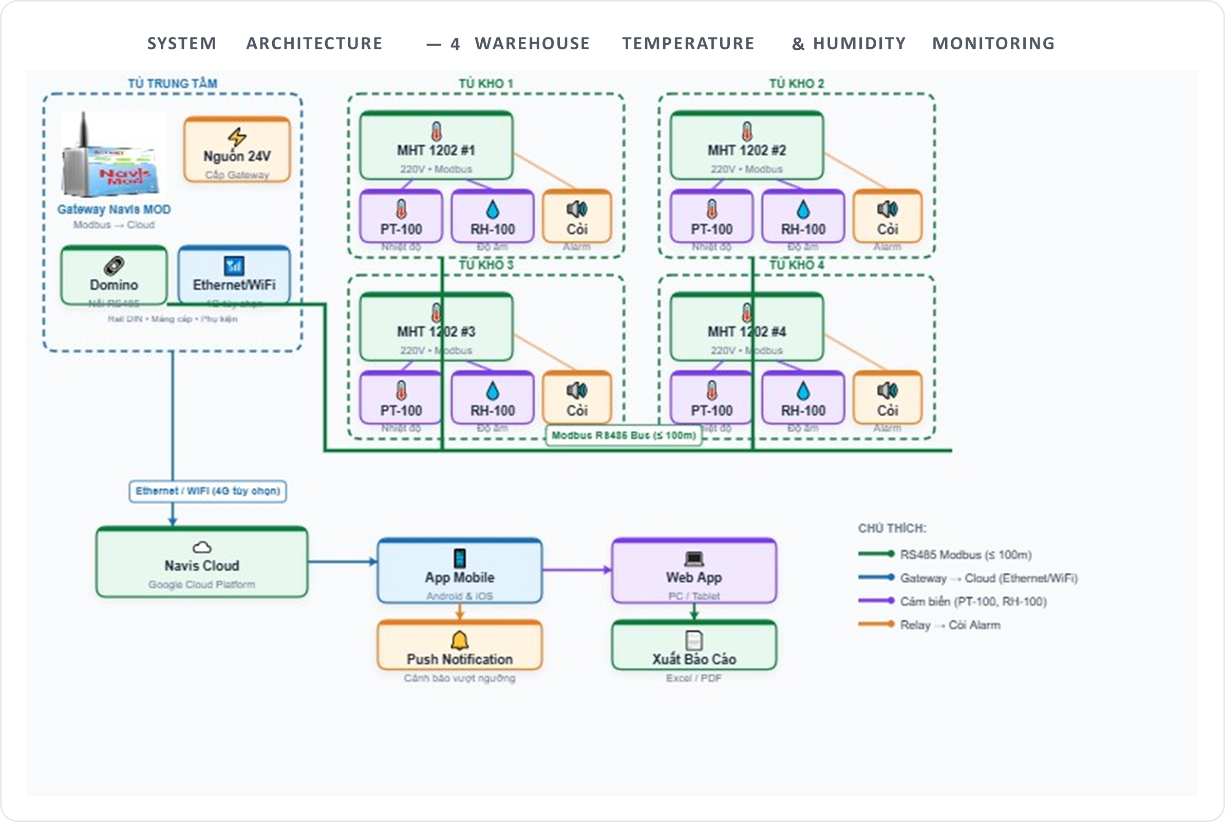 Hệ thống giám sát nhiệt độ & độ ẩm cho 4 kho bảo quản, sử dụng thiết bị đo Multispan MHT 1202 kết hợp Gateway Navis MOD để truyền dữ liệu lên Cloud và hiển thị trên App điện thoại & phần mềm Web.