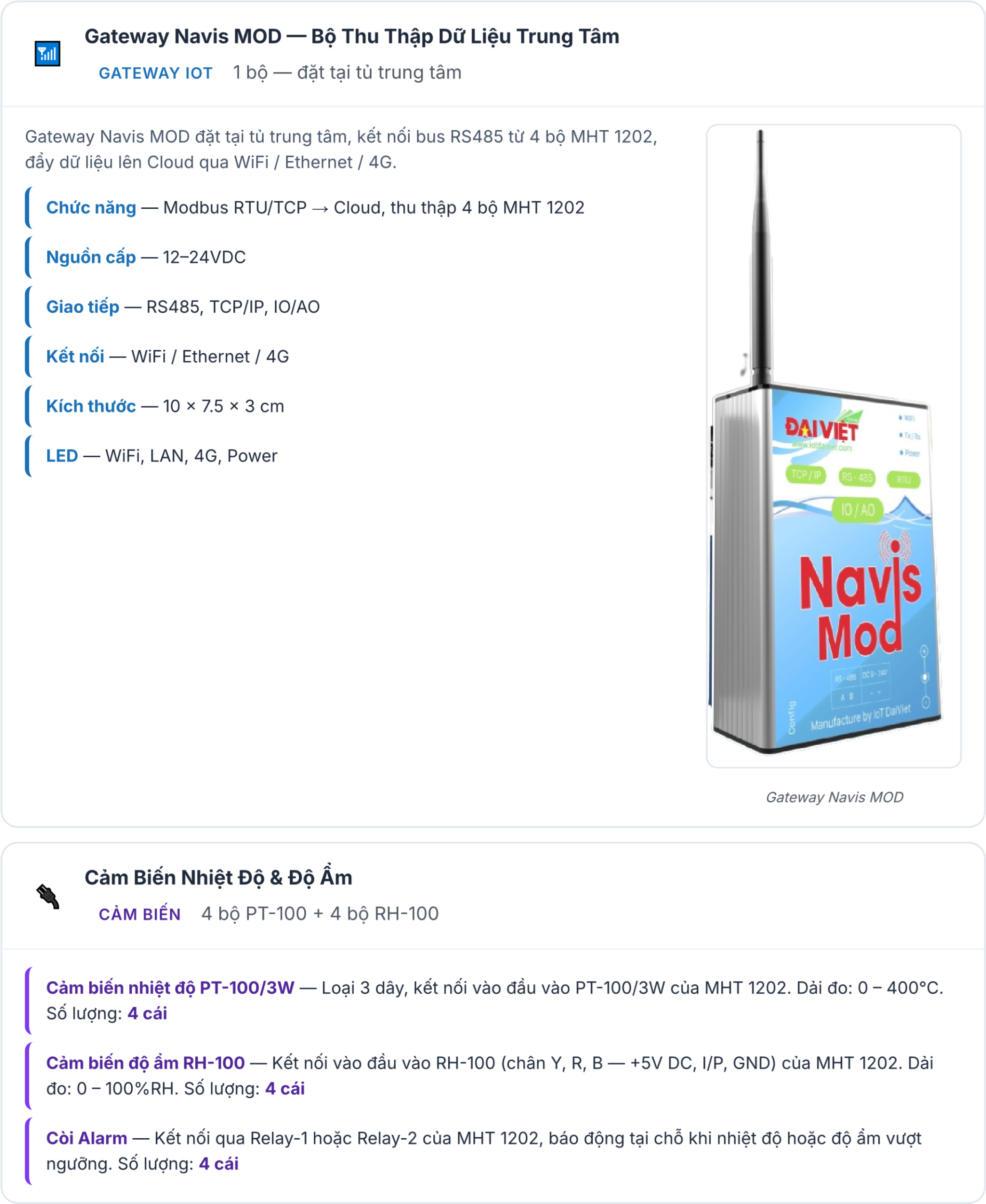 | 5 | Gateway Navis MOD | 1 bộ | Thu thập dữ liệu Modbus từ 4 bộ MHT