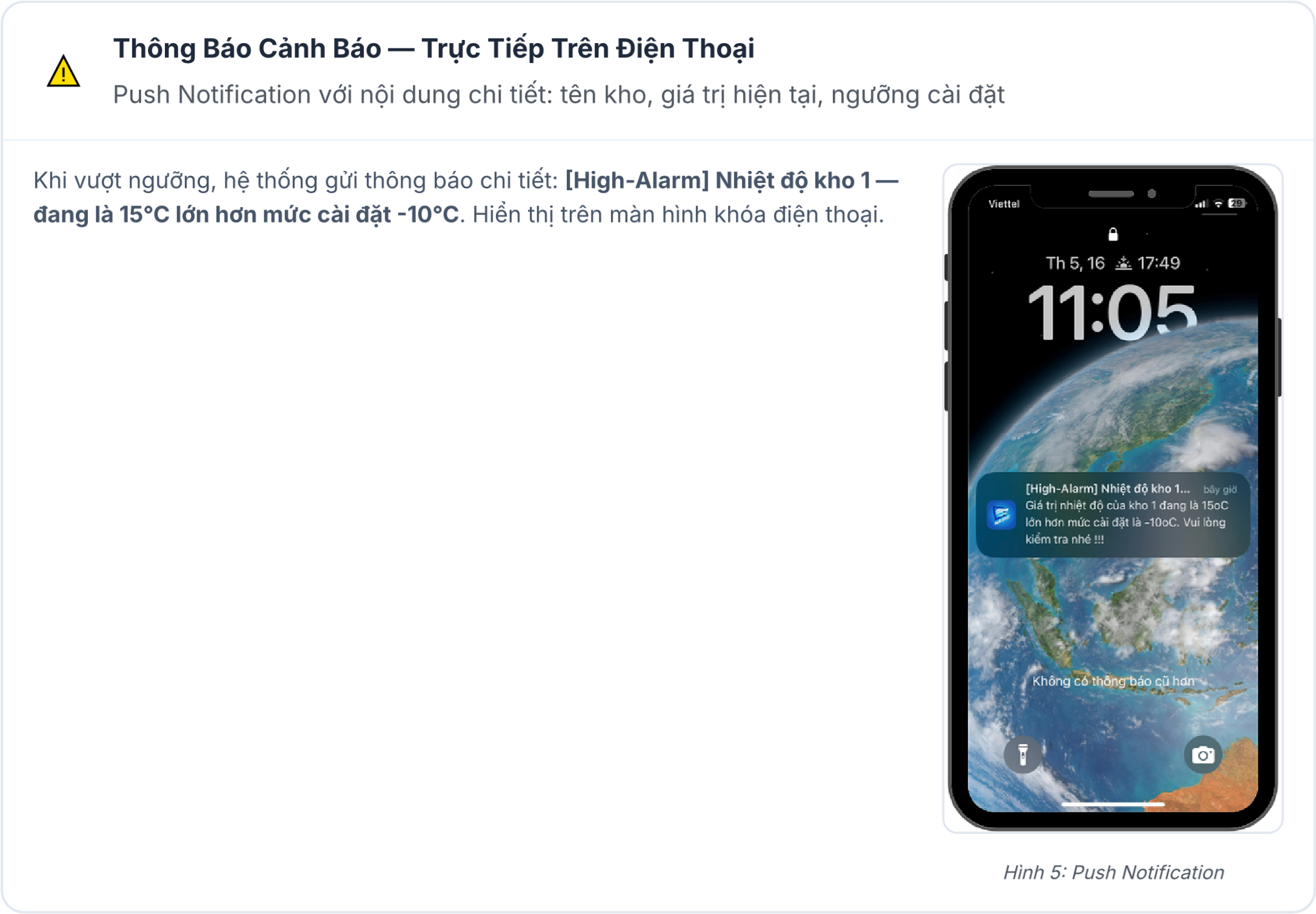 🔔 Cảnh Báo Vượt Ngưỡng – Push NotificationHệ thống tự động gửi thông báo đẩy (Push Notification) lên điện thoại của người quản lý khi nhiệt độ hoặc độ ẩm vượt ngưỡng cài đặt. Thông báo hiển thị ngay trên màn hình khóa, đảm bảo xử lý kịp thời.