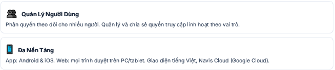 Phần mềm giám sát hoạt động trên 2 nền tảng: App điện thoại (Android & iOS) và Web trên máy tính. Ngôn ngữ: Tiếng Việt. Navis Cloud (Google Cloud).